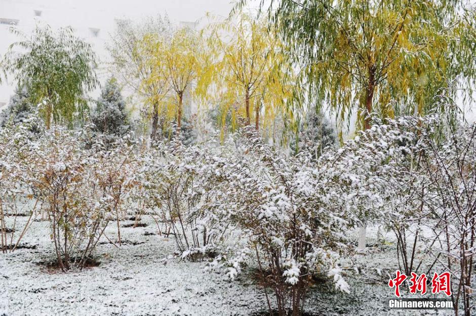 11月5日,甘肃河西走廊金昌市迎来降雪天气。据中国天气网发布消息,11月5日下午到夜间,酒泉、嘉峪关两市多云间阴,局部地方有小雪;省内其余地方阴有小雨(雪)或雨夹雪,其中,陇南、天水、平凉、庆阳等市局部地方有中雨(雪)。图为甘肃河西走廊金昌市区雪景。 杨艳敏 摄