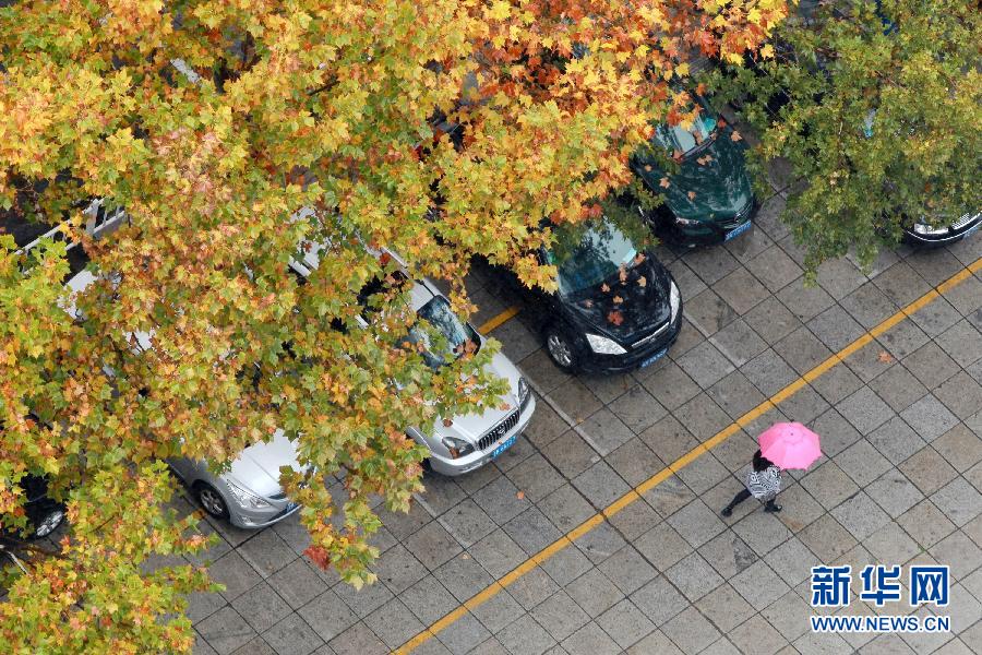 11月5日,一名行人在山东威海昆明路冒雨出行。当日,山东省自南向北出现一次明显降雨天气过程。此轮大范围降雨,将有效缓解当地旱情,有利于增加蓄水、涵养地下水源。 新华社发(刘中华摄)
