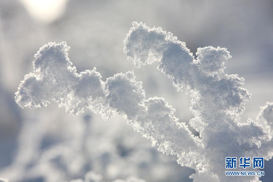 11月8日在新疆哈密天山风景区拍摄的晶莹剔透的树挂。当日,新疆哈密沿天山一带迎来降雪天气。雪后的天山景区银装素裹,美景如画。 新华社发(普拉提 摄)