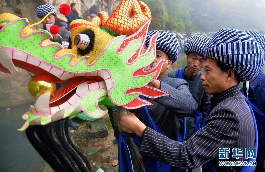 11月20日,在贵州松桃举行的“接龙”活动上,人们在整理“龙头”。当日,贵州省松桃苗族自治县世昌乡沟咀村举行“接龙”活动,当地苗族同胞身着盛装,敲锣打鼓,按照传统习俗“请龙、接龙、安龙”,感恩祈福。新华社发(龙元彬 摄)