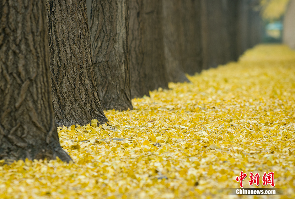 11月20日,北京上空飘起雨夹雪,并将迎来下半年首次寒潮天气。位于钓鱼台外的银杏大道也一改往日的热闹,金黄的银杏叶落满地,为数不多的游人抓紧时间拍下这里的美景,以免它匆匆溜走。 中新网记者 李卿 摄