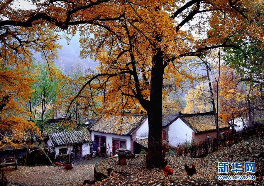 位于古银杏树包围之中的山村一角(11月19日摄)。在河南省西部山区的嵩县白河乡境内,有一个叫“下寺”的小山村。在以村庄为中心的方圆5平方公里内,完整地保存着一片古银杏林。据调查考证,仅千年以上的古银杏树就有121株,其中树龄最长的达2300多年。千百年来,下寺村的村民与这些古银杏树相伴为邻、“和睦”共处。为加强珍贵树种的保护,乡里对所有古树都进行了造册挂牌,并本着“谁管理谁受益”的原则,将每棵树都分包给了村民。如今这些千年古银杏树在村民的精心呵护下,枝繁叶茂,生机盎然。每到深秋季节,小山村漫天黄叶,遍地金色,一幢幢民房掩映在黄灿灿的彩色世界里,美丽极致。 新华社记者 王颂摄