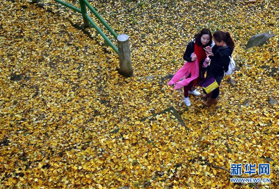 两位游客在落满银杏树叶的观景台上欣赏刚拍的照片(11月19日摄)。