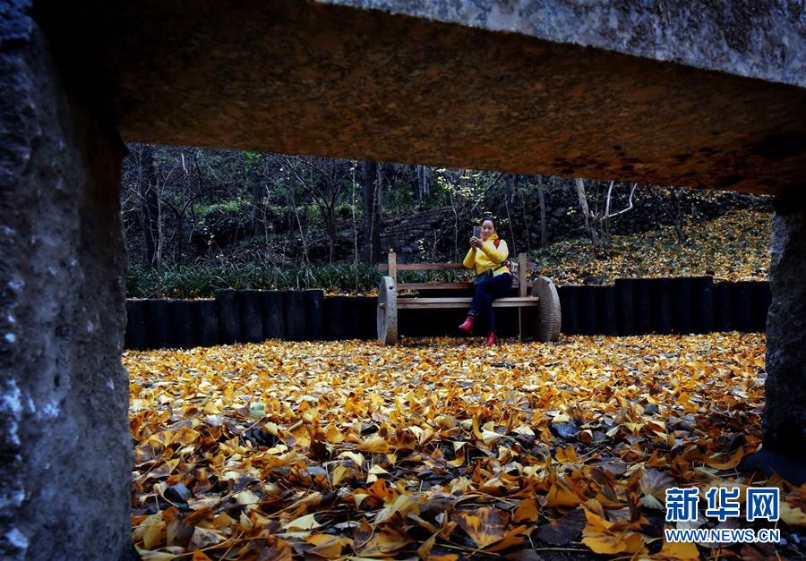 坐在银杏树下的一名游客用手机拍照(11月19日摄)。