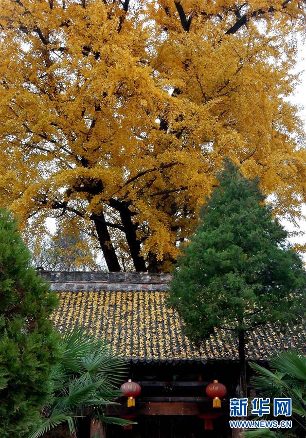村头古银杏树掩映中的一座寺庙(11月19日摄)。