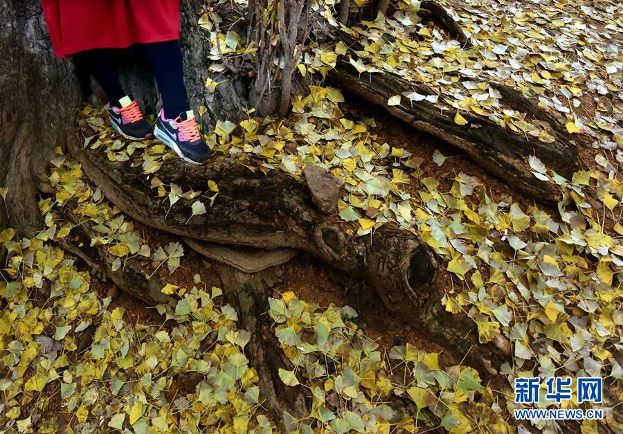 一名游客靠在一株千年古银杏树下歇息(11月19日摄)。
