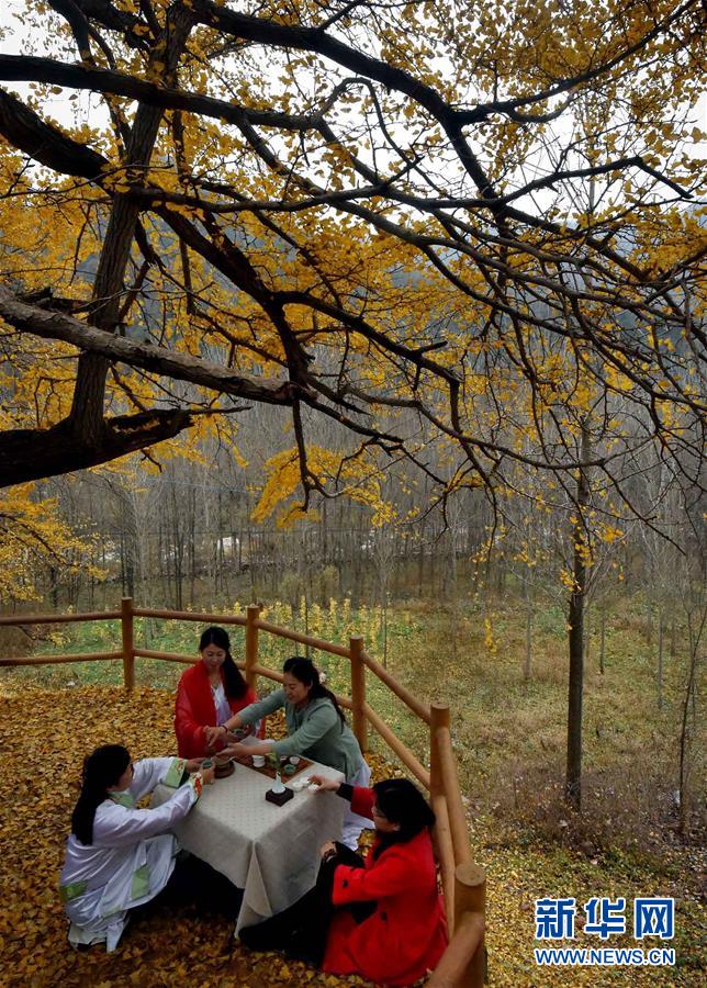 几位户外活动爱好者在古银杏树下展示茶道技艺(11月19日摄)。