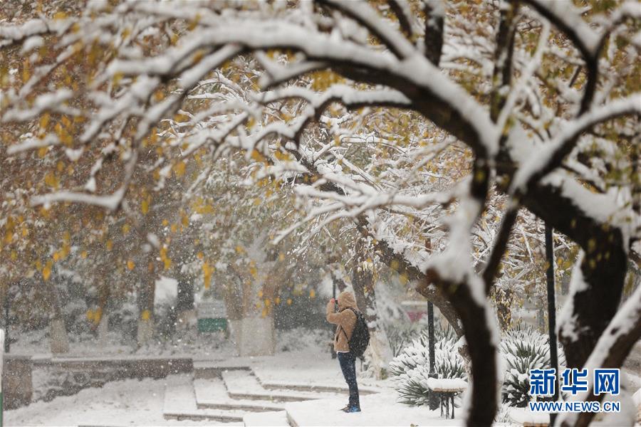 11月22日,南开大学新开湖雪景吸引路人。 新华社发(王晓明 摄)
