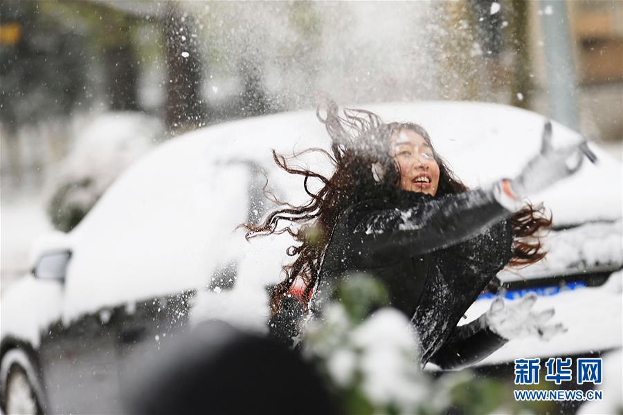 11月22日,在南开大学校园内,一名女青年在打雪仗。 新华社发(王晓明 摄)