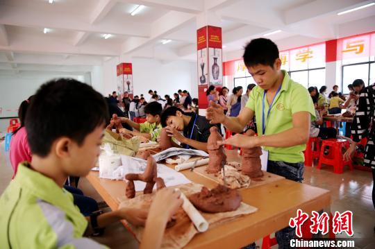 参赛的小学生在制作坭兴陶艺品。 曾开宏 摄