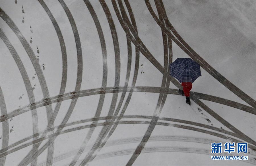2015年11月24日 雪中行 11月24日,一名行人在山东省临沂市郯城县街头冒雪出行。新华社发(张春雷 摄)