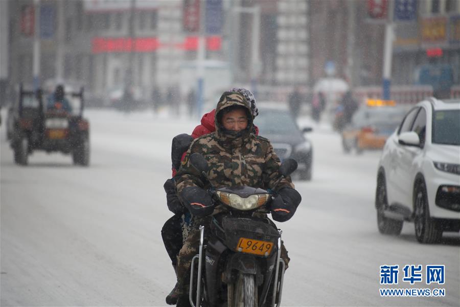 11月29日,在吉林省吉林市,行人在路上冒雪缓缓骑行。吉林省气象台29日14时46分发布暴雪蓝色预警,预计未来24小时,通化南部、白山、延边西南部、长白山保护区将出现大到暴雪。有关部门提醒人们出行做好防范,注意交通安全。新华社发(朱万昌 摄)