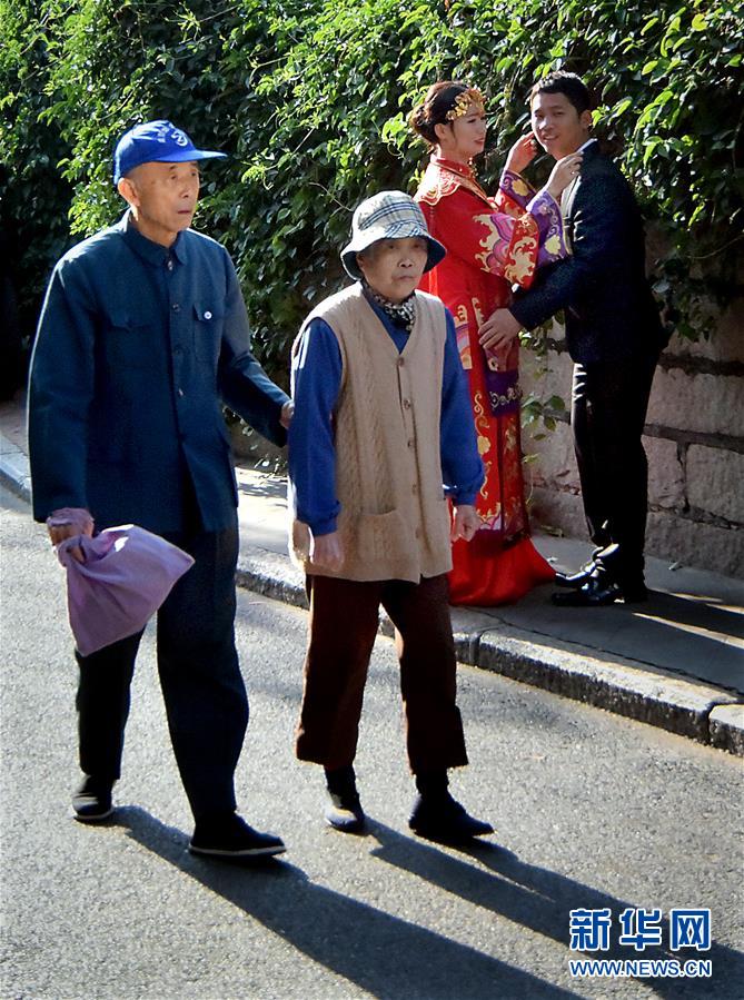 在厦门市华新路上,两位散步的老人与一对拍婚纱照的情侣“不期而遇”(11月27日摄)。厦门,中国东南沿海一座国际化的海湾城市。在这里,“时尚”是绕不开的话题。徜徉在厦门街头,随时能感受到“新的在旧的中,时尚在历史中”的城市气质。立一城时尚,谋一城发展。近年来,厦门市政府十分关注时尚产业,陆续建成一系列文化演艺及科技体验项目,每年的沙滩音乐节、鼓浪屿钢琴周、国际摄影季等活动,使时尚与市民生活密不可分。四面八方的来客也能时时领略这座“国际时尚之都”的独特魅力。新华社记者王颂摄