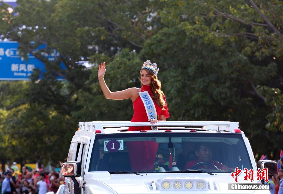 11月29日,海南三亚,正在三亚参加第65届世界小姐总决赛的120个国家和地区的佳丽们,乘坐花车在三亚市区巡游,展示风采。第65届世界小姐总决赛晚会将于12月19日在三亚举行。中新社记者 尹海明 摄