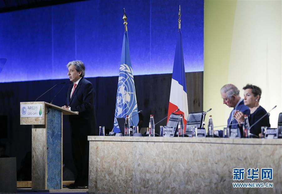 1月30日,在法国首都巴黎北部市郊的布尔歇展览中心,上届气候大会主席、秘鲁环境部长曼努埃尔·比达尔(左)在气候变化巴黎大会开幕式上致辞。当日,气候变化巴黎大会在法国巴黎布尔歇展览中心开始举行。来自150多个国家的领导人出席大会开幕活动,为巴黎协议谈判提供政治推动力。新华社记者 周磊 摄 图片来源:新华网