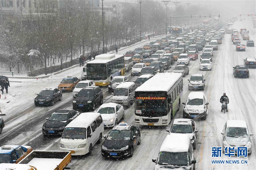12月2日,在哈尔滨市主干道中山路上,车辆在雪中行驶。