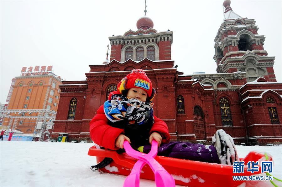 12月2日,小朋友在哈尔滨市区广场上的雪地上玩耍。新华社记者 王松 摄