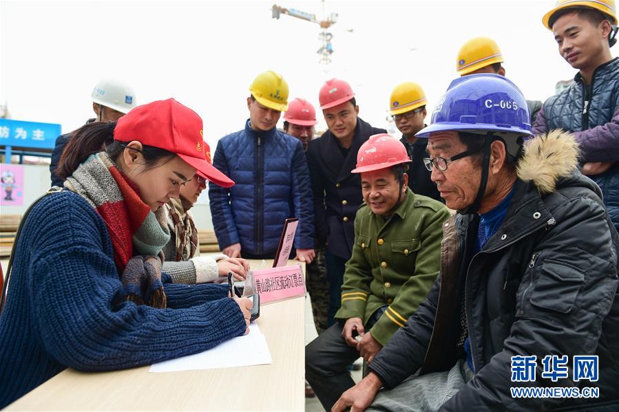 12月2日,志愿者在帮农民工买票。 当日,合肥市黄山路社区开展“关爱农民工情暖返乡路”订票活动,组织青年志愿者深入外来务工人员集中的建筑工地,帮助农民工在网上订票,方便他们及时买到春节返乡车票。 新华社记者杜宇 摄