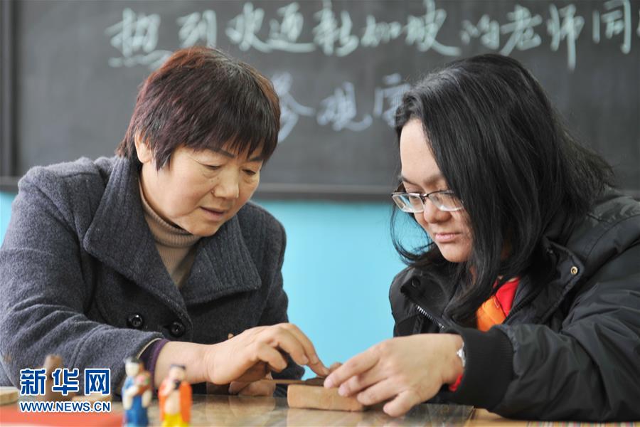 刘新霞(左)在自弘中学教来访的新加坡学生制作非物质文化遗产“泥叫叫”(11月24日)。新华社记者 陈昌奇 摄