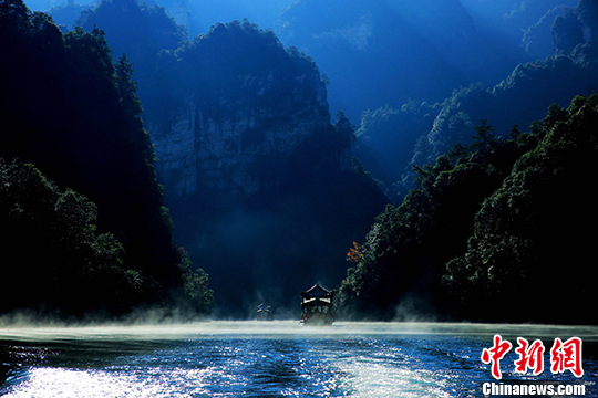 蓝天下的湖南张家界宝峰湖风景区,薄雾在湖面飘绕。 中新社记者 吴勇兵 摄