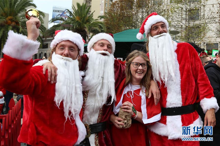 12月12日,在美国旧金山,人们身着圣诞服饰参加街头聚会。当天,旧金山举办一年一度的圣诞老人大聚会活动,数百民众扮成圣诞老人或穿上圣诞服饰,在市内聚会、狂欢、巡游,营造节日气氛。新华社发(刘艺霖摄)