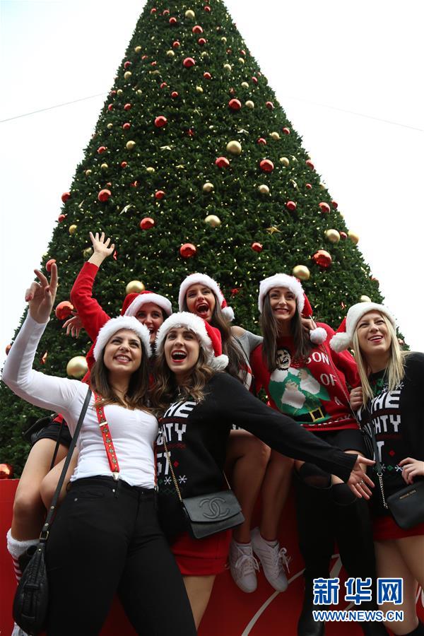 12月12日,在美国旧金山,几名女子身着圣诞服饰参加街头聚会。当天,旧金山举办一年一度的圣诞老人大聚会活动,数百民众扮成圣诞老人或穿上圣诞服饰,在市内聚会、狂欢、巡游,营造节日气氛。新华社发(刘艺霖摄)