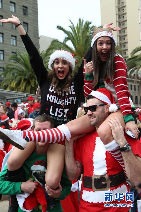 12月12日,在美国旧金山,人们身着圣诞服饰参加街头聚会。当天,旧金山举办一年一度的圣诞老人大聚会活动,数百民众扮成圣诞老人或穿上圣诞服饰,在市内聚会、狂欢、巡游,营造节日气氛。新华社发(刘艺霖摄)