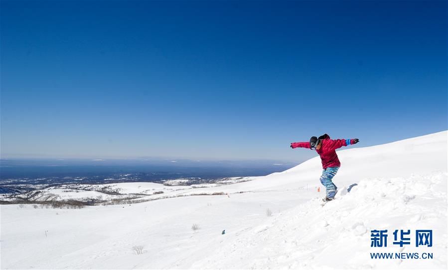 一名滑雪爱好者在长白山天然滑雪公园滑单板(2013年3月14日摄)。 新华社记者 许畅摄