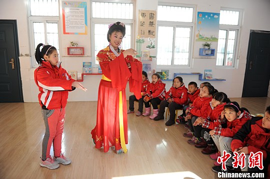 12月17日,庐剧演员王琴在教小学生表演庐剧。中新社记者 张娅子 摄