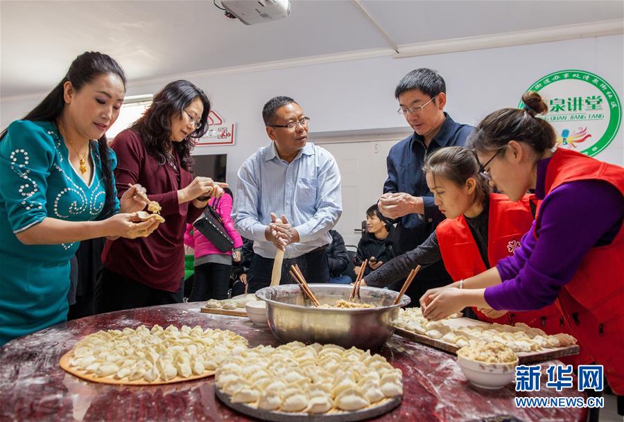 12月21日,在呼和浩特市玉泉区清泉街社区,人们在为环卫工人包饺子。 12月22日是二十四节气中的冬至,我国许多地区都有吃饺子迎接冬至的习俗。 新华社发(丁根厚 摄)