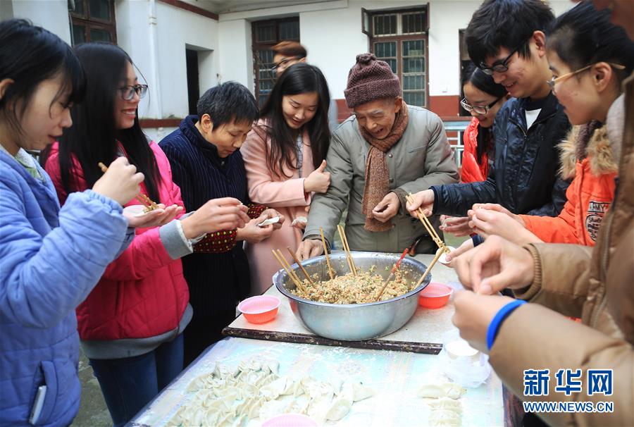 12月21日,在湖南衡阳蒸湘区呆鹰岭敬老院,南华大学医学院的青年志愿者与老人一起包饺子。 12月22日是二十四节气中的冬至,我国许多地区都有吃饺子迎接冬至的习俗。 新华社发(曹正平 摄)
