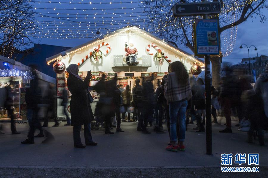 12月20日晚,人们在法国巴黎香榭丽舍大街的圣诞集市上参观。受恐怖袭击影响,巴黎今年的圣诞市场没有往年热闹。但随着圣诞节的临近,巴黎传统的圣诞灯光秀、圣诞集市和百货商店圣诞橱窗仍吸引大批游客前来观赏。新华社发(迪奥·杜瓦尔摄)