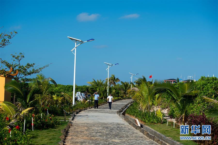 两位岛民在赵述岛新建成的步道上散步(12月13日摄)。时下正值冬季,在我国南部的海南省三沙市,温暖的气候、迷人的海岛、朴实的渔民、风光旖旎的日出日落,共同绘就一幅我国南海独有的瑰丽画面。新华社记者刘潺摄