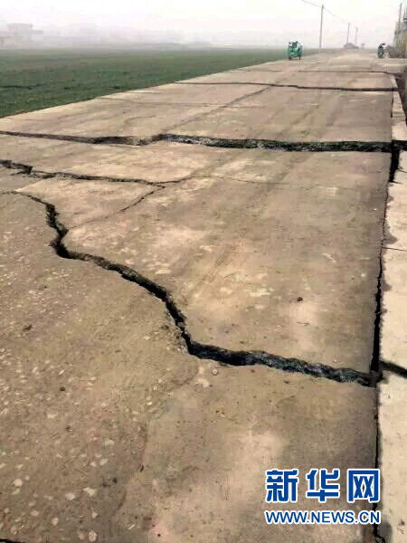 12月25日,山东省临沂市平邑县一乡间道路被地震损坏(手机拍摄)。据中国地震台网测定,北京时间2015年12月25日7时56分,在山东省临沂市平邑县(北纬35.5度,东经117.7度)发生4.0级地震,震源深度约10公里。新华社发