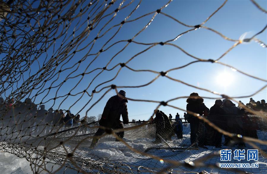 12月27日,在哈尔滨市道里区长岭湖,捕鱼农民在收网。当日,冒着零下20多摄氏度的“极寒”低温,位于哈尔滨市道里区的长岭湖开始了今年冬捕的“头一网”。作为哈尔滨市的冰雪旅游品牌之一,长岭湖冬捕冰钓在吸引众多游客的同时,也让当地农民从“猫冬”变成“忙冬”。新华社记者王建威摄