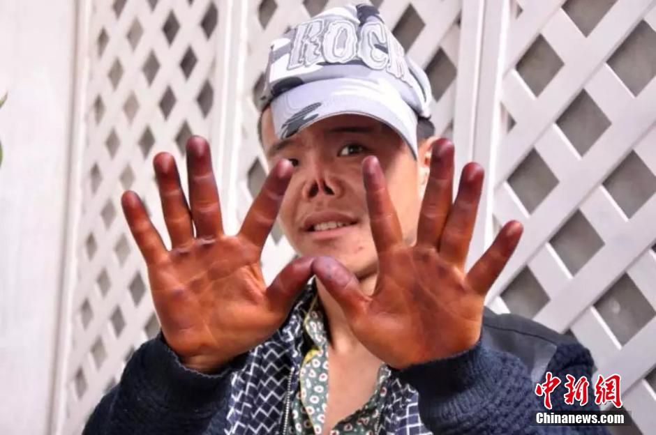 李明展示他在核桃炼油厂工作之后的双手,长时间的工作双手呈现深棕色。 钟欣 摄