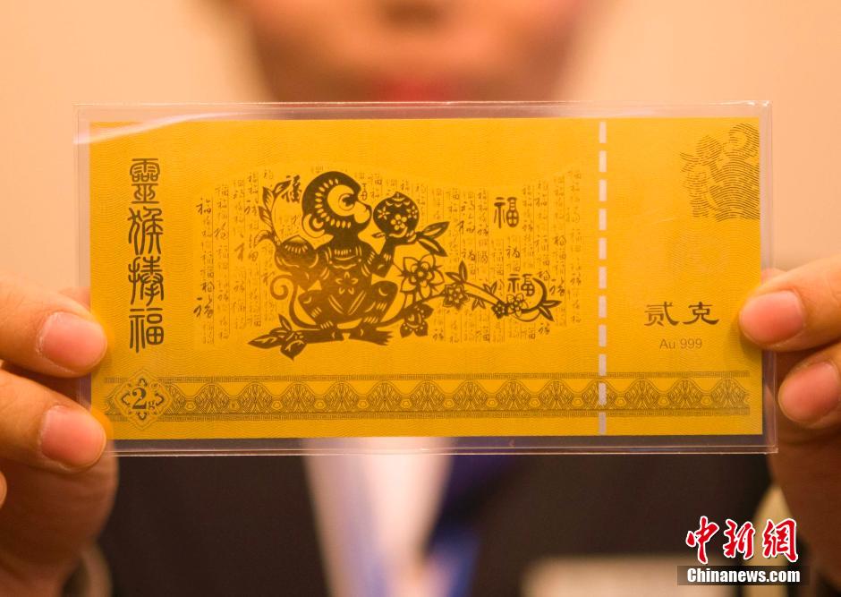 临近新年,各种猴年金钞纷纷登场亮相。12月29日,山西太原交通银行工作人员展示由黄金打造的“灵猴捧福”贺岁金钞。 中新社记者 张云 摄