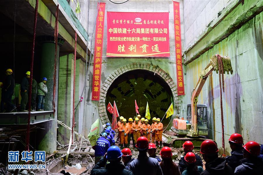 12月29日,中铁16局员工在合肥轨道交通1号线大东门站庆祝“通通号”盾构机破土而出。当日,合肥地铁1号线太湖路站至大东门站盾构区间右线顺利贯通,标志安徽省首条轨道交通线路隧道工程实现全线贯通。下一步将依次实现轨通、电通及通车。预计在2016年底,合肥地铁1号线将试运营。新华社记者 杜宇 摄