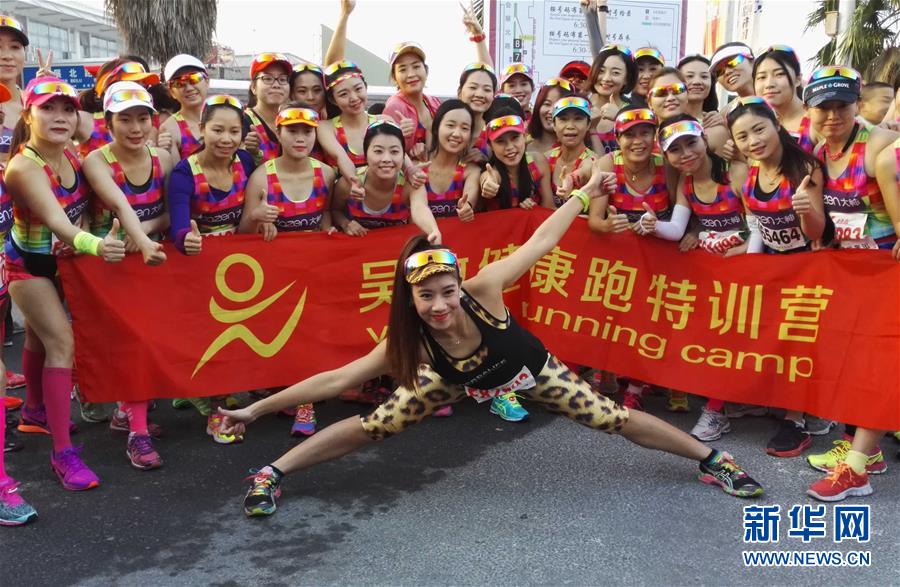 1月2日,前马拉松冠军吴敏(前)在开赛前与美女跑团合影。
