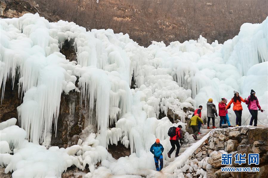 1月3日,游客在顺平县龙居生态风景区观赏冰瀑景观。进入冬季,地处太行山深处的河北省顺平县龙居生态风景区形成独特的人工冰瀑景观,形态奇特、晶莹剔透的冰瀑奇景蔚为壮观,吸引众多游客前来观赏游玩。新华社记者 朱旭东摄