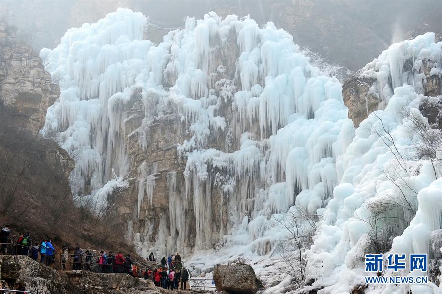 1月3日,游客在顺平县龙居生态风景区观赏冰瀑景观。进入冬季,地处太行山深处的河北省顺平县龙居生态风景区形成独特的人工冰瀑景观,形态奇特、晶莹剔透的冰瀑奇景蔚为壮观,吸引众多游客前来观赏游玩。新华社记者 朱旭东摄