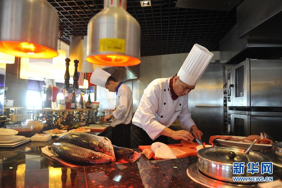 1月8日,中央电视塔空中观景旋转餐厅厨师在制作加工挪威三文鱼。当日,为迎接即将到来的新春佳节,位于北京西三环中路的中央电视塔空中观景旋转餐厅举办的“挪威三文鱼开冰美食节”正式开幕。美食节期间,食客可以品尝到现场制作的从挪威空运来的新鲜三文鱼等多种美食。据悉,此次美食节将持续至1月24日。新华社记者鲁鹏摄