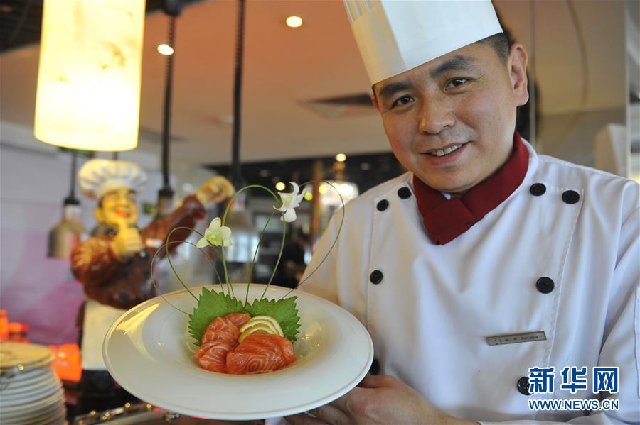 1月8日,中央电视塔空中观景旋转餐厅厨师在展示刚刚制作完成的挪威三文鱼菜品。当日,为迎接即将到来的新春佳节,位于北京西三环中路的中央电视塔空中观景旋转餐厅举办的“挪威三文鱼开冰美食节”正式开幕。美食节期间,食客可以品尝到现场制作的从挪威空运来的新鲜三文鱼等多种美食。据悉,此次美食节将持续至1月24日。新华社记者鲁鹏摄