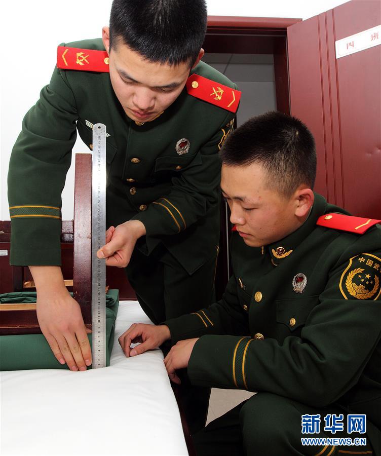 1月10日,新兵方靖(右)在老兵的帮助下学习叠被子。武警上海总队七支队新战士方靖和他一道入伍的战友,年龄都在18岁左右,是名副其实的“95后”。近期,他们在完成三个月新兵连的历练后补充到基层连队。在执勤岗位上,方靖和战友们锤炼作风、磨练意志,在每一个需要的哨位上发光发热,不断成长和进步。新华社记者 陈飞 摄