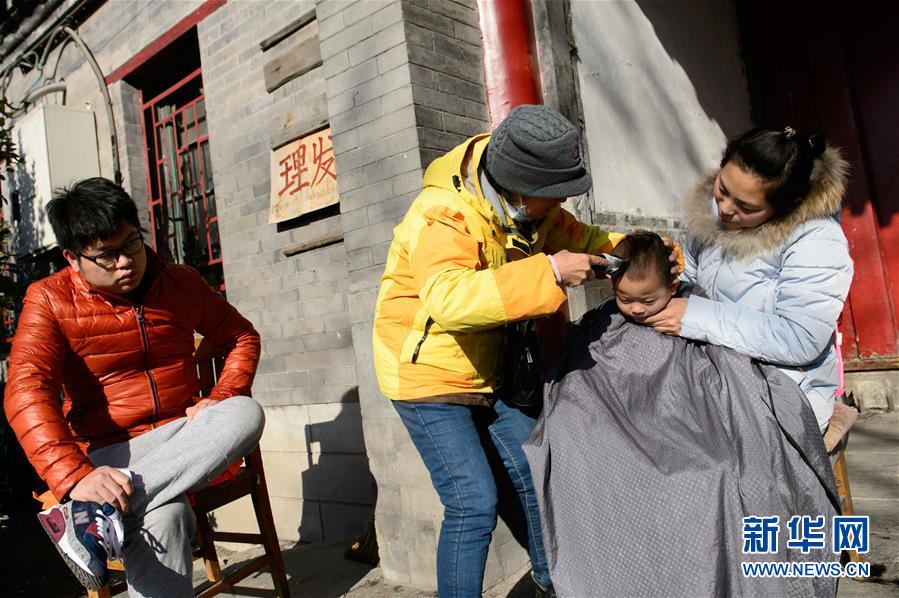 父母带着孩子在后海边街头理发摊理发(1月9日摄)。新华社记者 尹栋逊摄