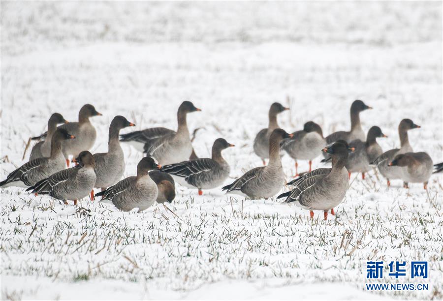 1月12日,在江苏省盱眙县河桥镇猫耳湖畔,一群大雁在雪地里觅食。当日,江苏省淮安市迎来2016年首场降雪,气温普遍下降6摄氏度以上。 新华社发(周海军 摄)