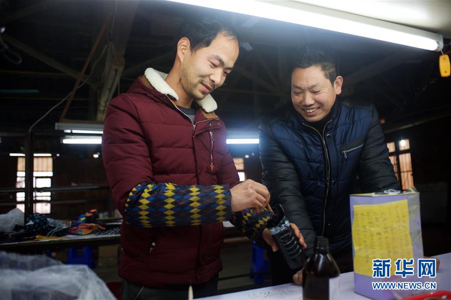 1月11日,廖志军(右一)和一名工人用化学药剂对耳机进行防水处理。