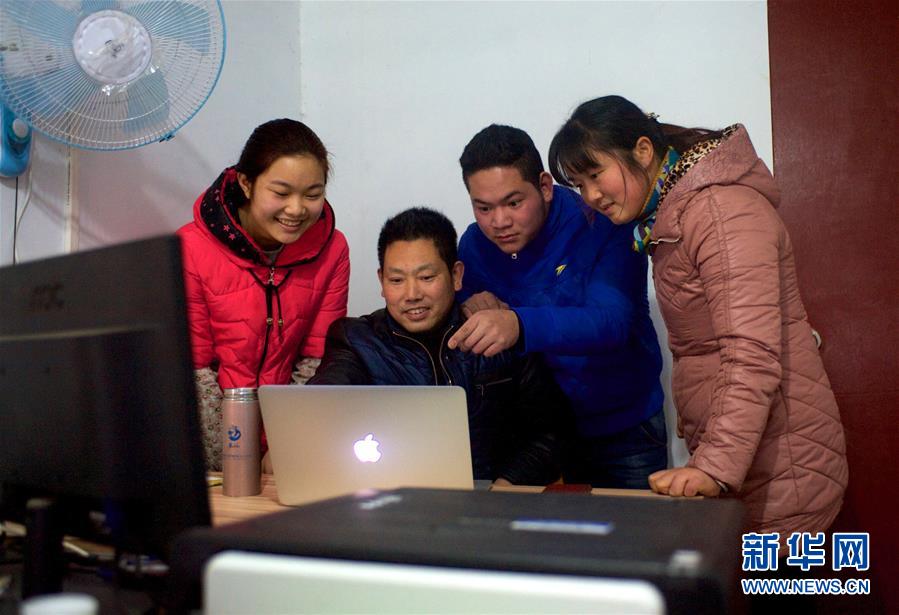 1月11日,廖志军(左二)和工人在网上查看耳机的销售情况。 新华社记者 胡晨欢摄