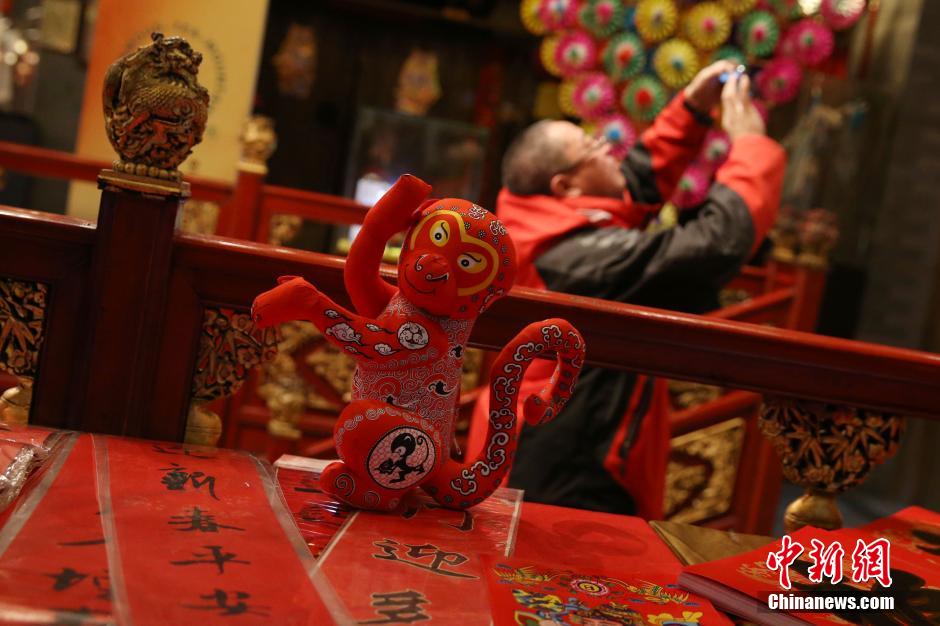 1月13日,市民在众多“猴”吉祥物中拍照。近日,随着农历猴年临近,各种以“猴”为主题的玩偶亮相北京,受到市民青睐。 中新社记者 韩海丹 摄