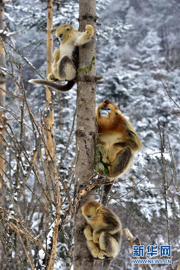 神农架野生金丝猴雪趣